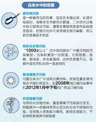 對日益惡化的水源污染問題,自來水廠所采取的方式便是加入大量超過標準的氯(漂白粉)來消毒殺菌。專家指出,隨著經濟的發展,人口的增加,不少地區水源短缺,有的城市飲用水水源污染嚴重,居民生活飲用水安全受到威脅。