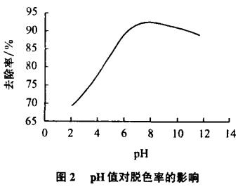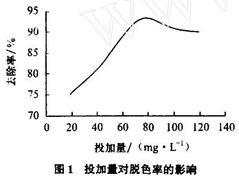 從圖1可見,對于聚合氯化鋁鐵,最佳投加量在80mg/L左右。投加量在20~80mg/L范圍內,色度的去除率隨投加量的增加而迅速從75%增加到93%左右.隨著投加量的增加,曲線呈上升趨勢。在投加量超過80mg/L以后,PAFC絮凝劑過飽和,顆粒表面有過多的聚合物分子,其表面已無吸附空位而使聚合物失去架橋作用。同時由于高分子吸附膜的空間位阻效應使顆粒間互相排斥,顆粒又重新分散處于穩定分散狀態,這反映在圖中就是曲線呈緩慢下降趨勢,同時由于絮凝劑本身呈亮黃色,投加量過大,未反應的絮凝劑溶于水中,使水的色度增大,可見絮凝劑的投加量并非越多越好,而是需要一個合適的范圍之內才能達到廢水處理達標的目的。